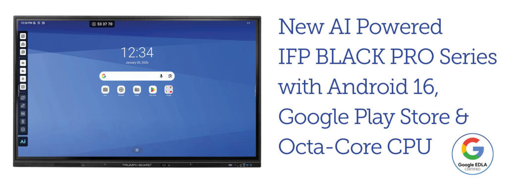 TRIUMPH BOARD announces the new IFP BLACK PRO Series 2026, now available in 65″, 75″, 86″, and 98″ sizes, and fully upgraded to Android 16 with Google EDLA certification.